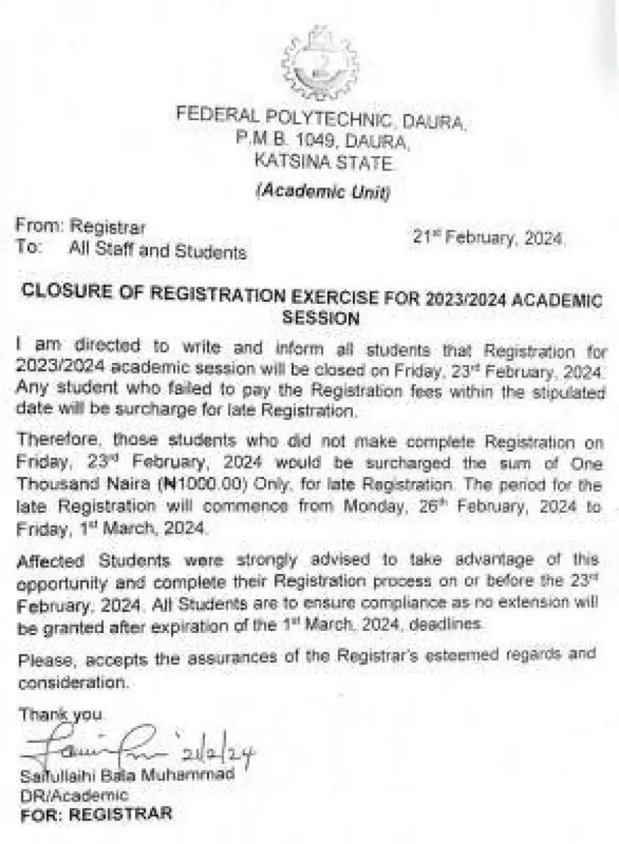 Fed Poly Daura notice on closure of Registration, 2023/2024