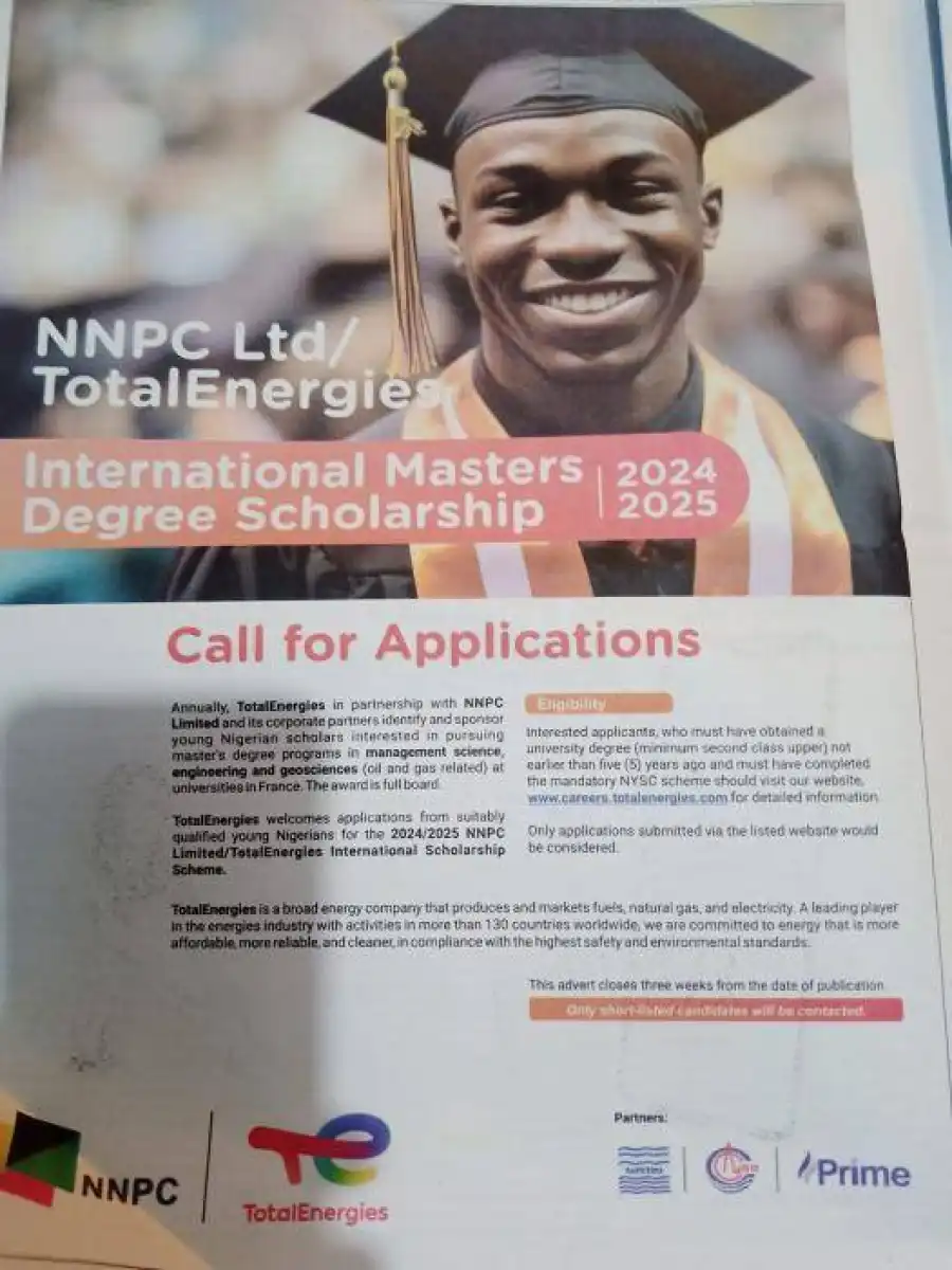Total Energies is inviting young Nigerians who qualify to apply for the 2024/2025 NNPC Limited/TotalEnergies International Scholarship Program. The TotalEnergies International Scholarship is a scholarship that gives Nigerian students a special chance to get their Masters degrees at leading universities in France.