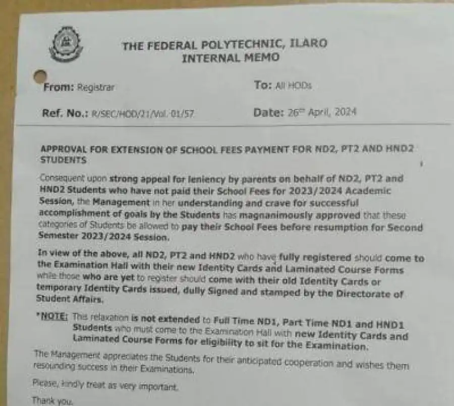 Fed Poly Ilaro approval for extension of school fees payment for ND2, PT2 & HND2, 2023/2024