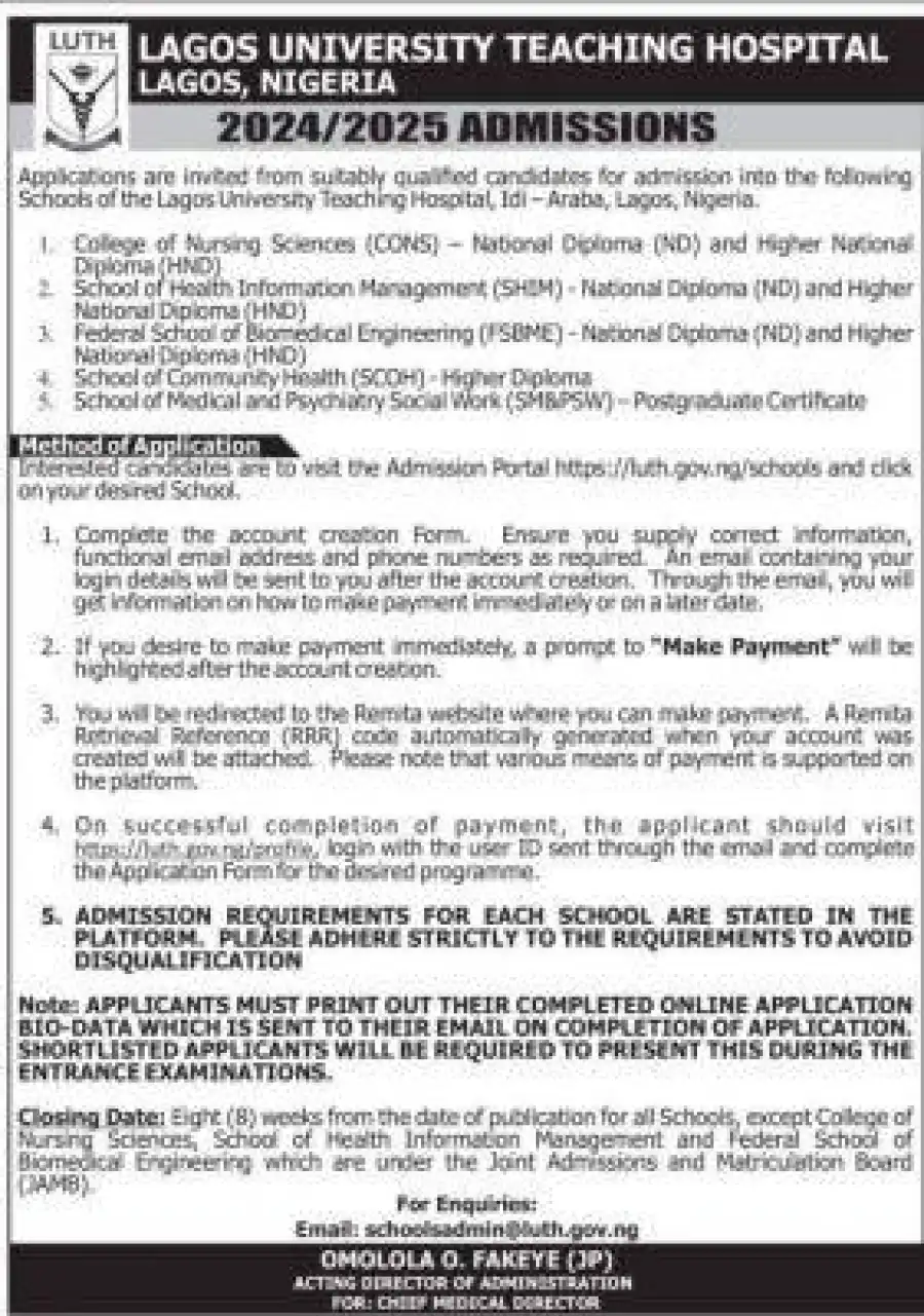 Interested candidates are to visit the Admission Portal https://luth.gov.ng/courses and click on your desired School.