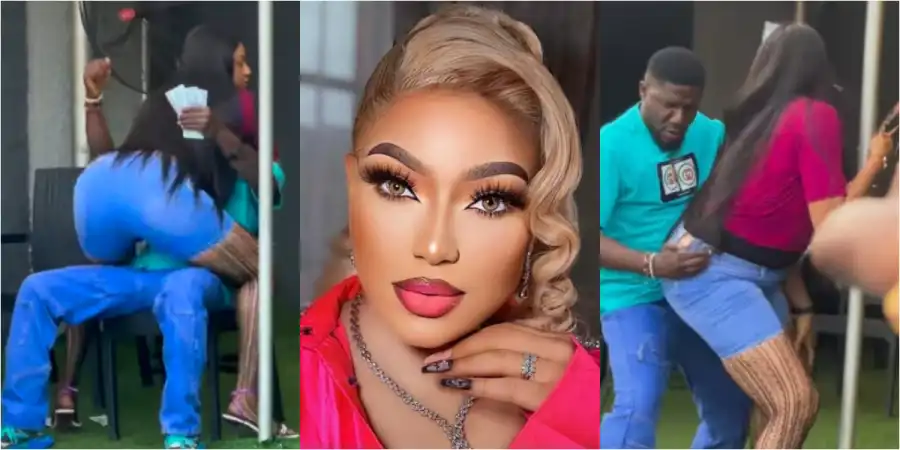 Queeneth was seen twerking ferociously on the man seated on a chair by the pool on the movie set.