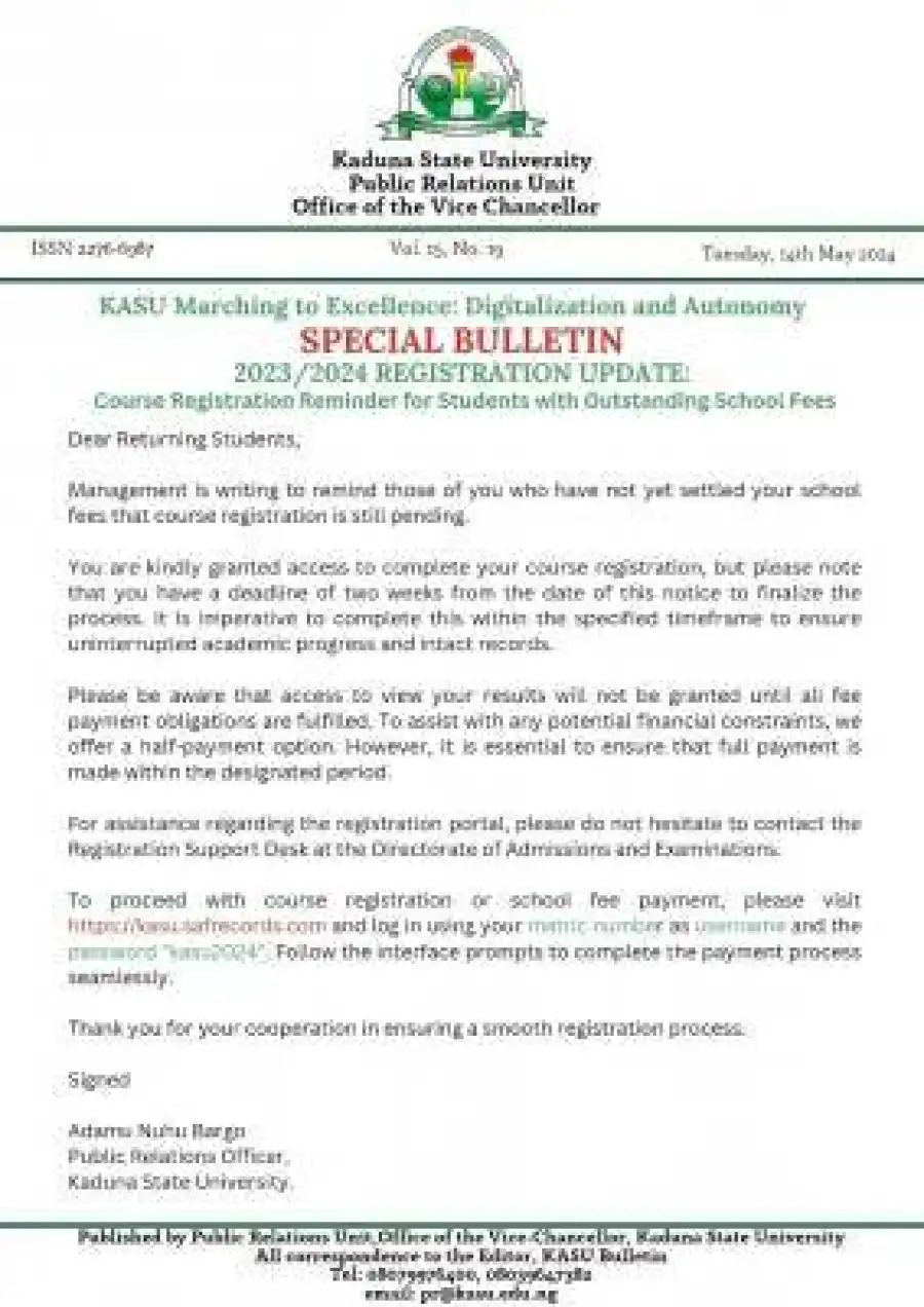 Management of Kaduna State University (KASU) is writing to remind returning students who have not yet settled their school fees that course registration is still pending.