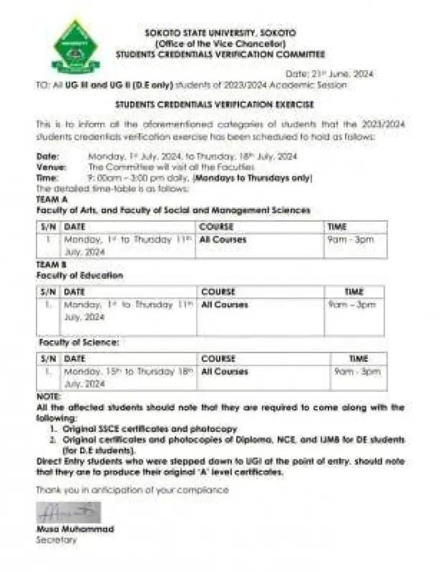 Sokoto State University undergraduate & DE students credentials verification exercise, 2023/2024
