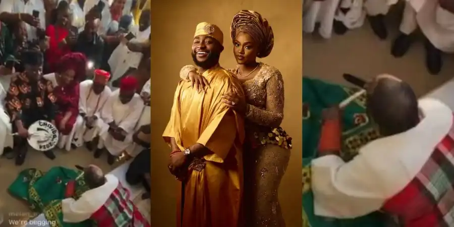 Chioma Avril Rowland, the wife of popular Nigerian singer David Adedeji Adeleke, known popularly as Davido, turns heads on social media as a video shows the moment she gave her husband palm wine to drink at their wedding.