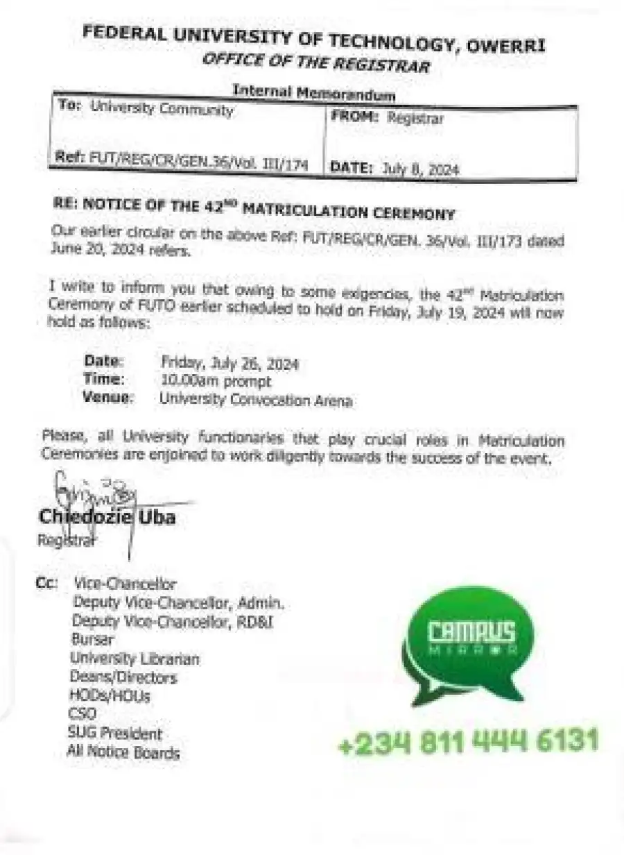 This is to inform all students of the Federal University of Technology Owerri and the University Community that owing to some emergencies, the 42nd Matriculation Ceremony earlier scheduled to hold on Friday, 19th July, 2024 will now hold as follows;