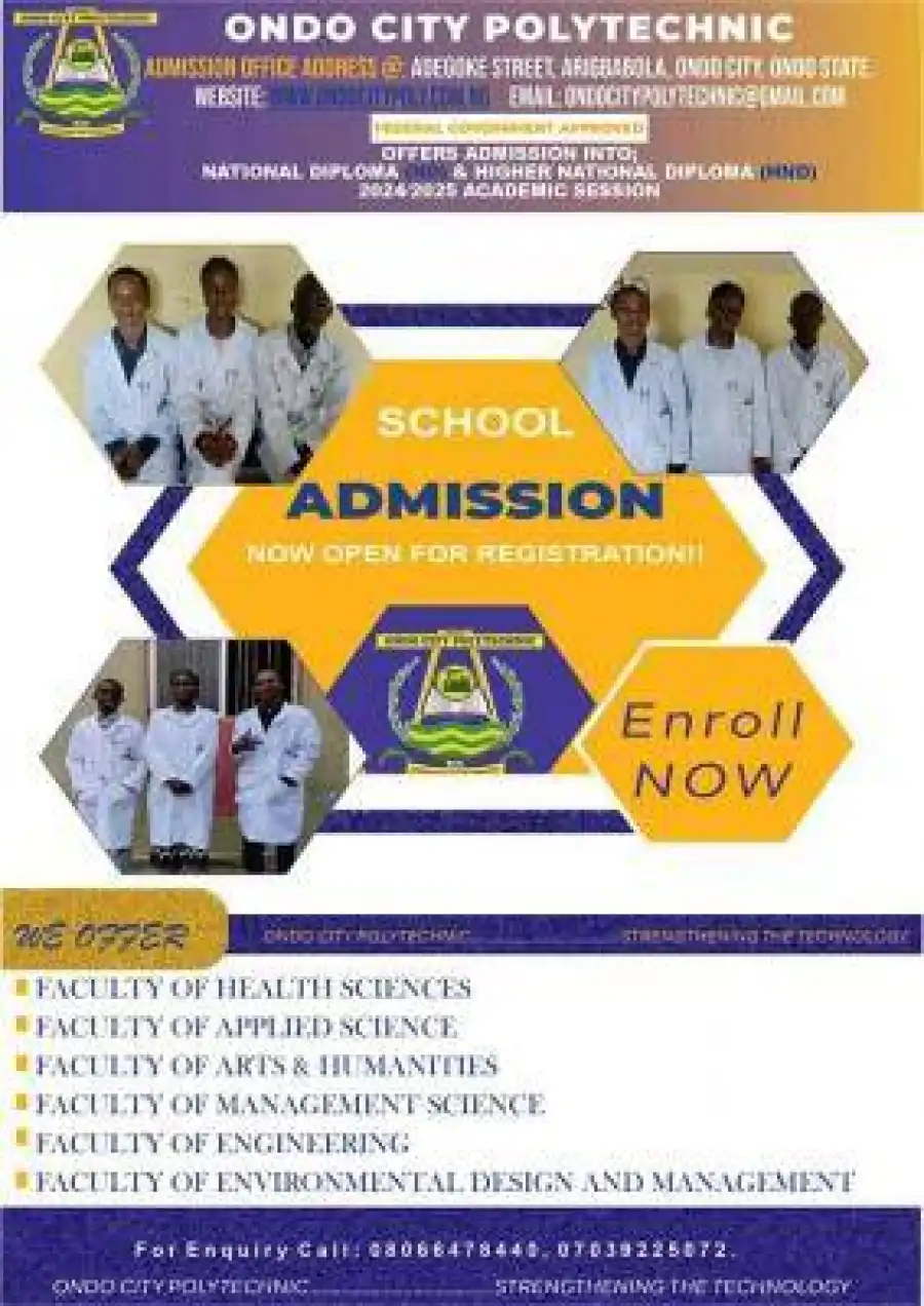The management of Ondo City Polytechnic (OCPOTECH) have started the commencement of 2024/2025 Post-UTME registration. Candidates who sat for 2024 UTME and score a minimum cut-off mark of 120 can apply.