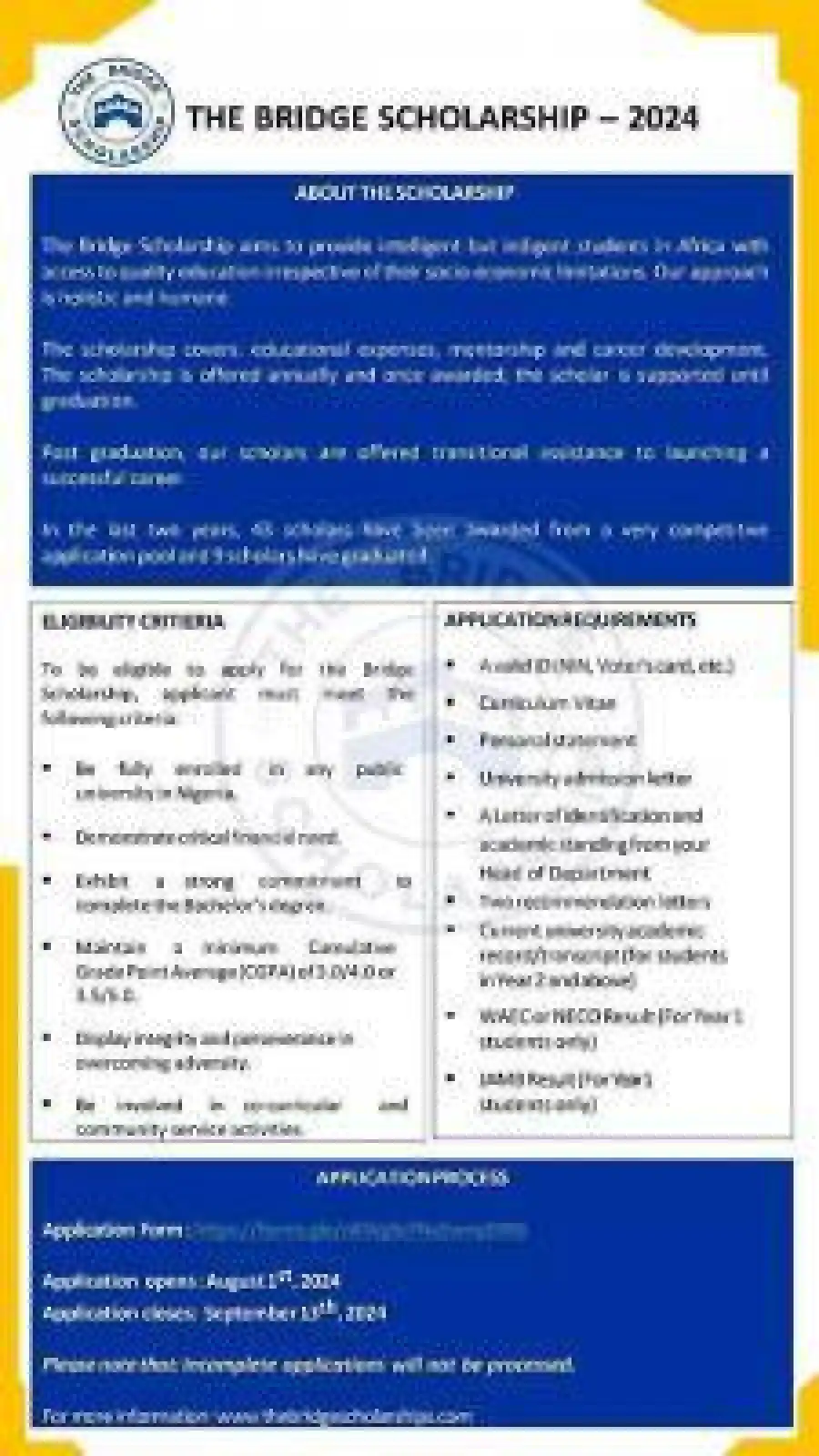 To be eligible to apply for the Bridge Scholarship, applicant must meet following criteria: