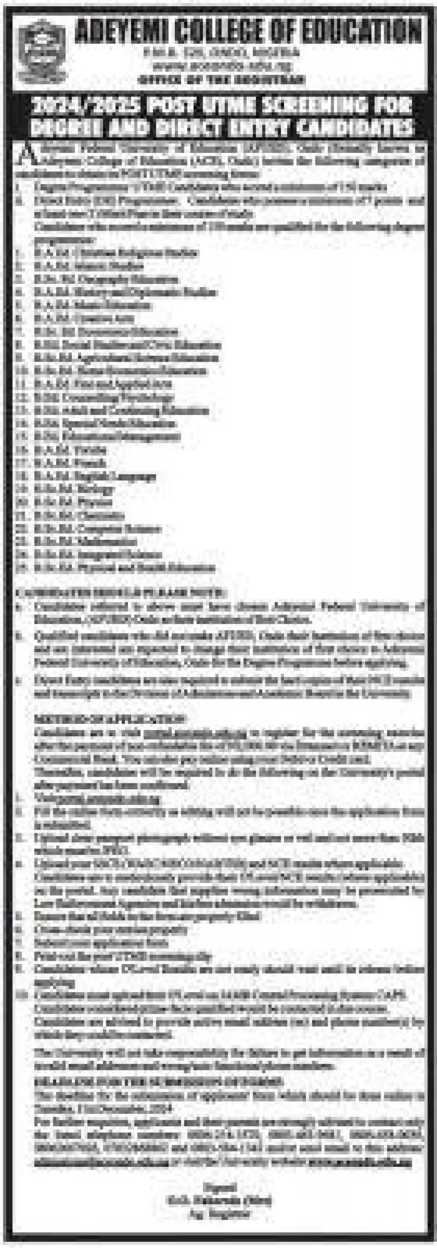 The Adeyemi Federal University of Education, Ondo State (formerly known as Adeyemi College of Education, Ondo State) invites the following categories of candidates to obtain its Post-UTME screening forms for the 2024/2025 Academic Session.