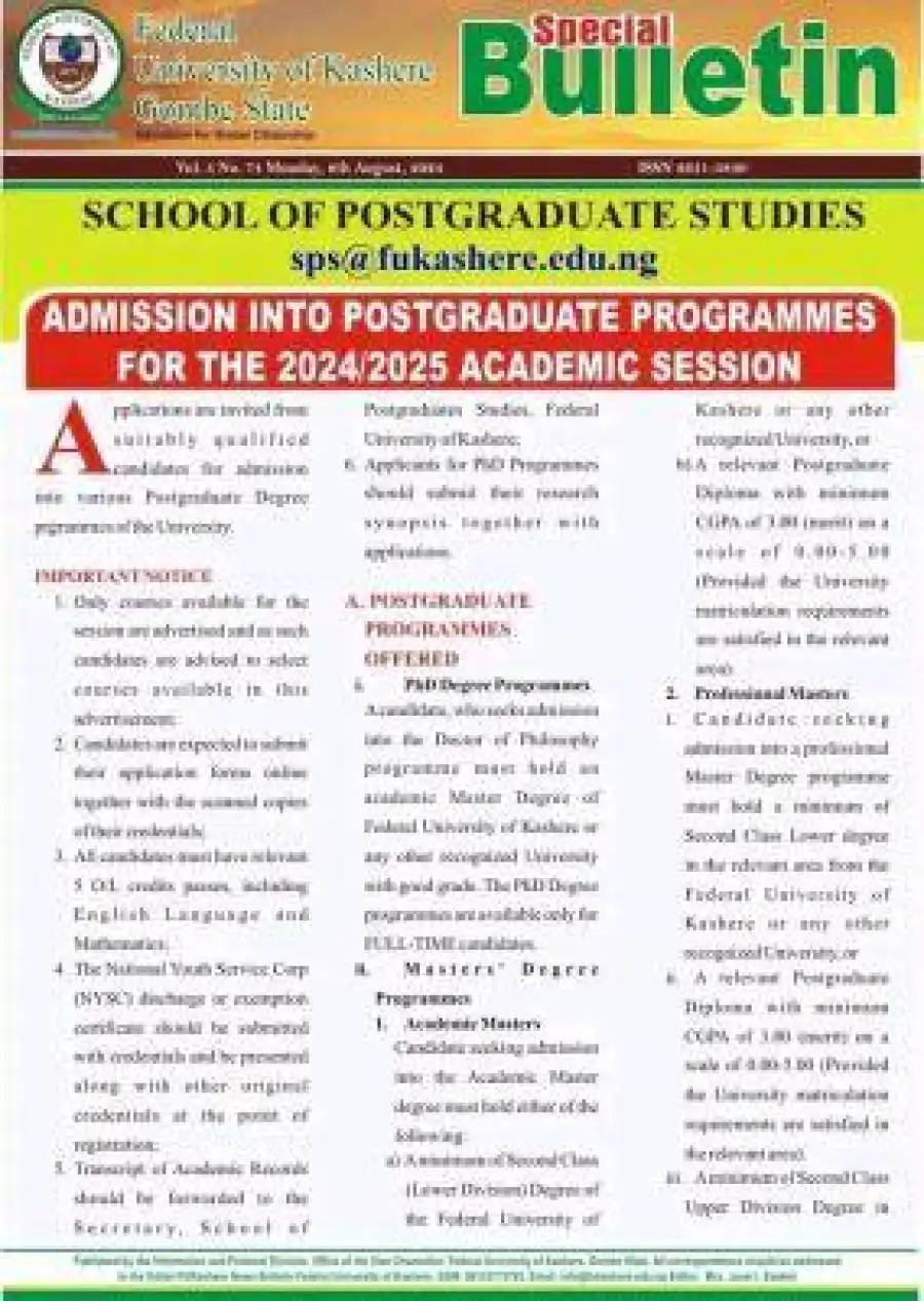 Applications are invited from suitably qualified candidates for admission into various Postgraduate Degree programmes of the Federal University Kashere for the 2024/2025 Academic Session.
