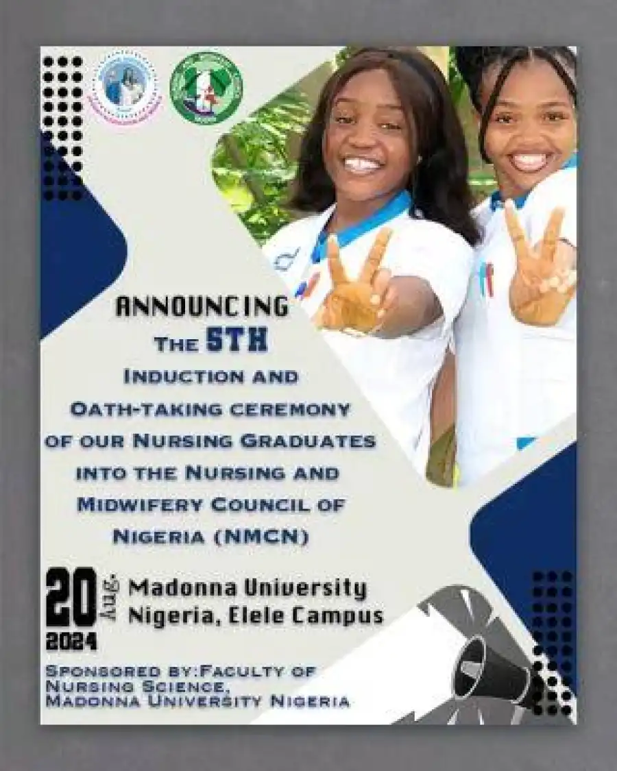 The Management of the Madonna University wishes to invite the general public to her 5th Induction/Oath-Taking Ceremony for Graduating Nurses into the Nursing And Midwifery Council of Nigeria (NMCN). The event has been scheduled to hold as follows;
