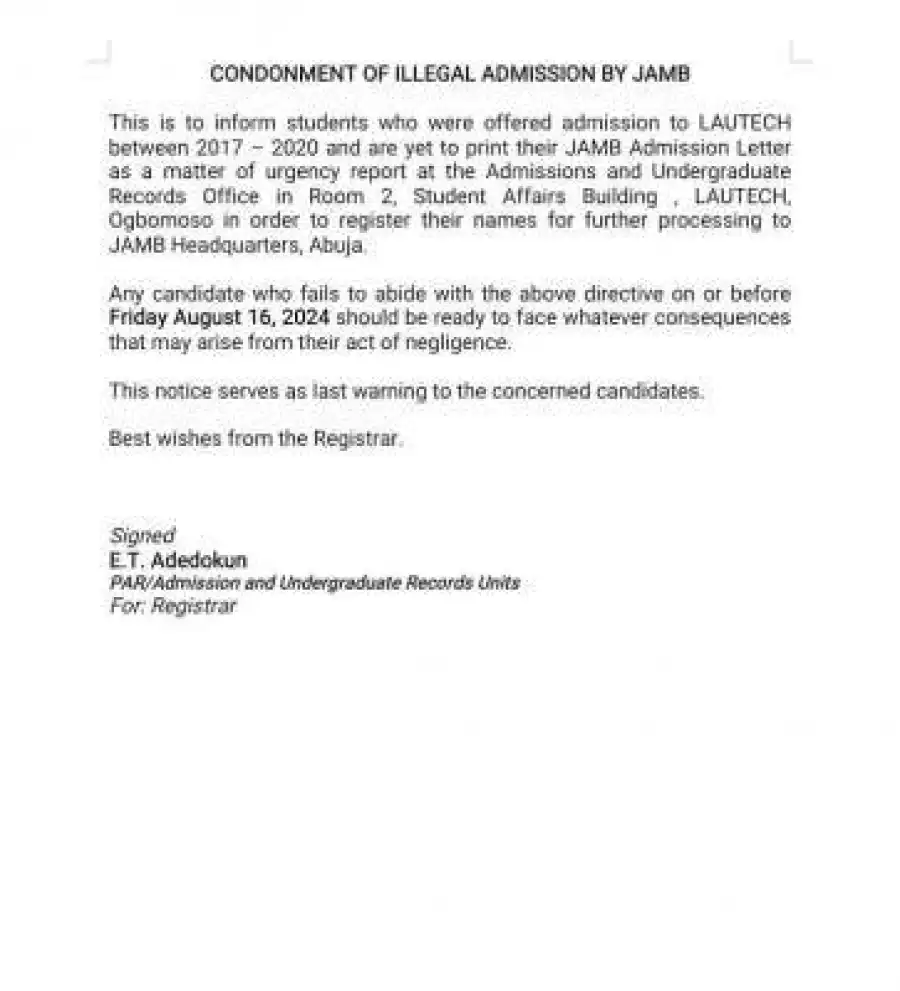 This is to inform Student who offered admission to LAUTECH between 2017-2020 and are yet to print their JAMB admission letter as matter of urgency report at the Admissions and undergraduate Records Office in Room 2, Student Affairs Building, LAUTECH, Ogbomoso in order to register their names for further processing to JAMB Headquarters, Abuja.