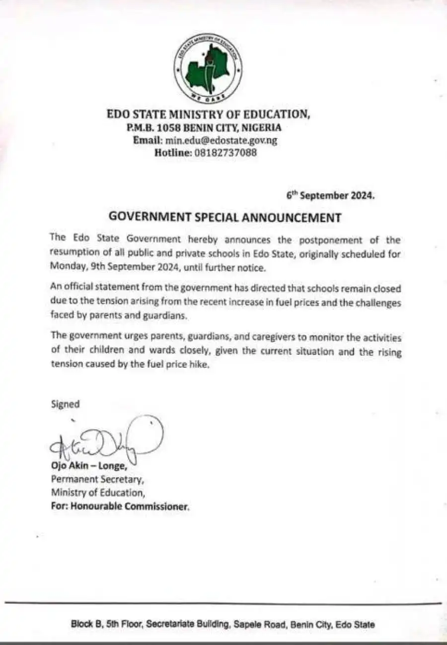 The Edo State Government hereby announces the postponement of the resumption of all public and private schools in Edo State, originally scheduled for Monday, 9th September 2024, until further notice.