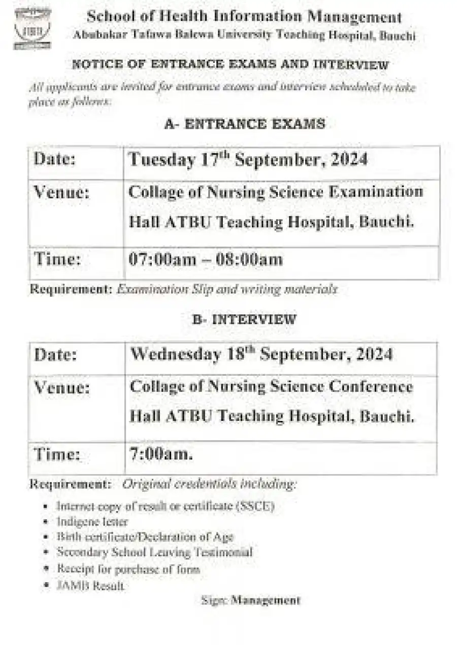 ATBUTH School of Health Information Management notice of entrance exam and interview