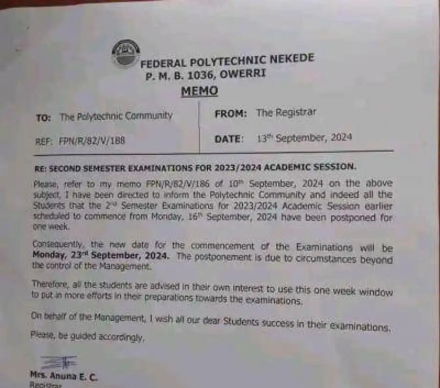 Please, refer to my memo FPN/R/82/V/186 of 10th September, 2024 on the above subject, I have been directed to inform the Polytechnic Community and indeed all the Students that the 2nd Semester Examinations for 2023/2024 Academic Session earlier scheduled to commence from Monday, 16th September, 2024 have been postponed for one week.
