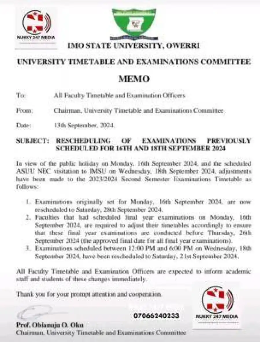 This is to inform all students of the Imo State University that in view of the public holiday on Monday, 16th September 2024, and the scheduled ASUU NEC visitation to IMSU on Wednesday, 18th September 2024, adjustments have been made to the 2023/2024 Second Semester Examinations Timetable as follows: