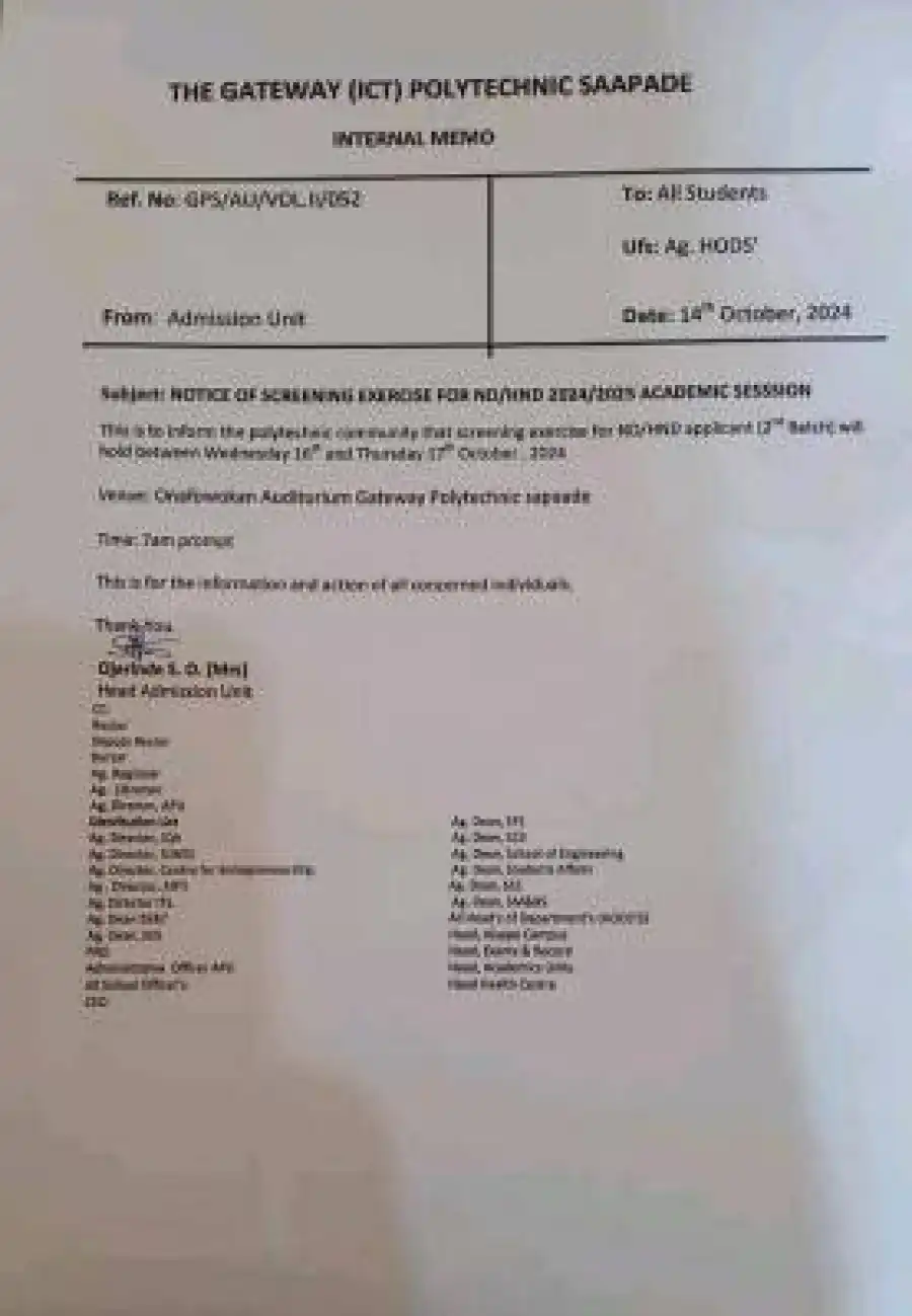 This is to inform the polytechnic community that screening exercise for ND/HND applicant (2nd Batch) will hold between Wednesday 16th and Thursday 17th October, 2024