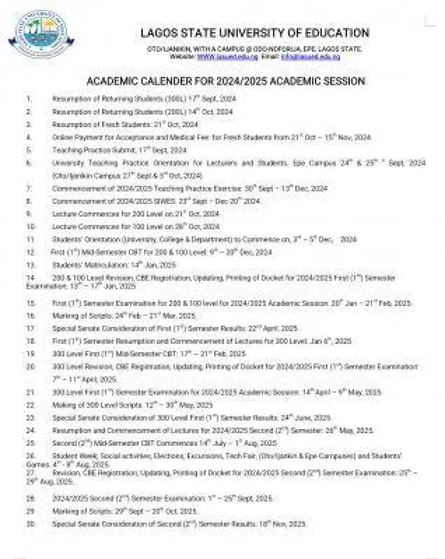 LASUED approved academic calendar, 2024/2025
