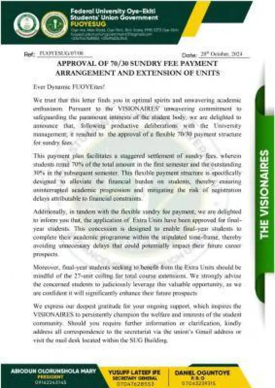 We trust that this letter finds you in optimal spirits and unwavering academic enthusiasm. Pursuant to the VISIONAIRES' unwavering commitment to safeguarding the paramount interests of the student body, we are delighted to announce that, following productive deliberations with the University managemnent; it resulted to the approval of a flexible 70/30 payment structure for sundry fees.