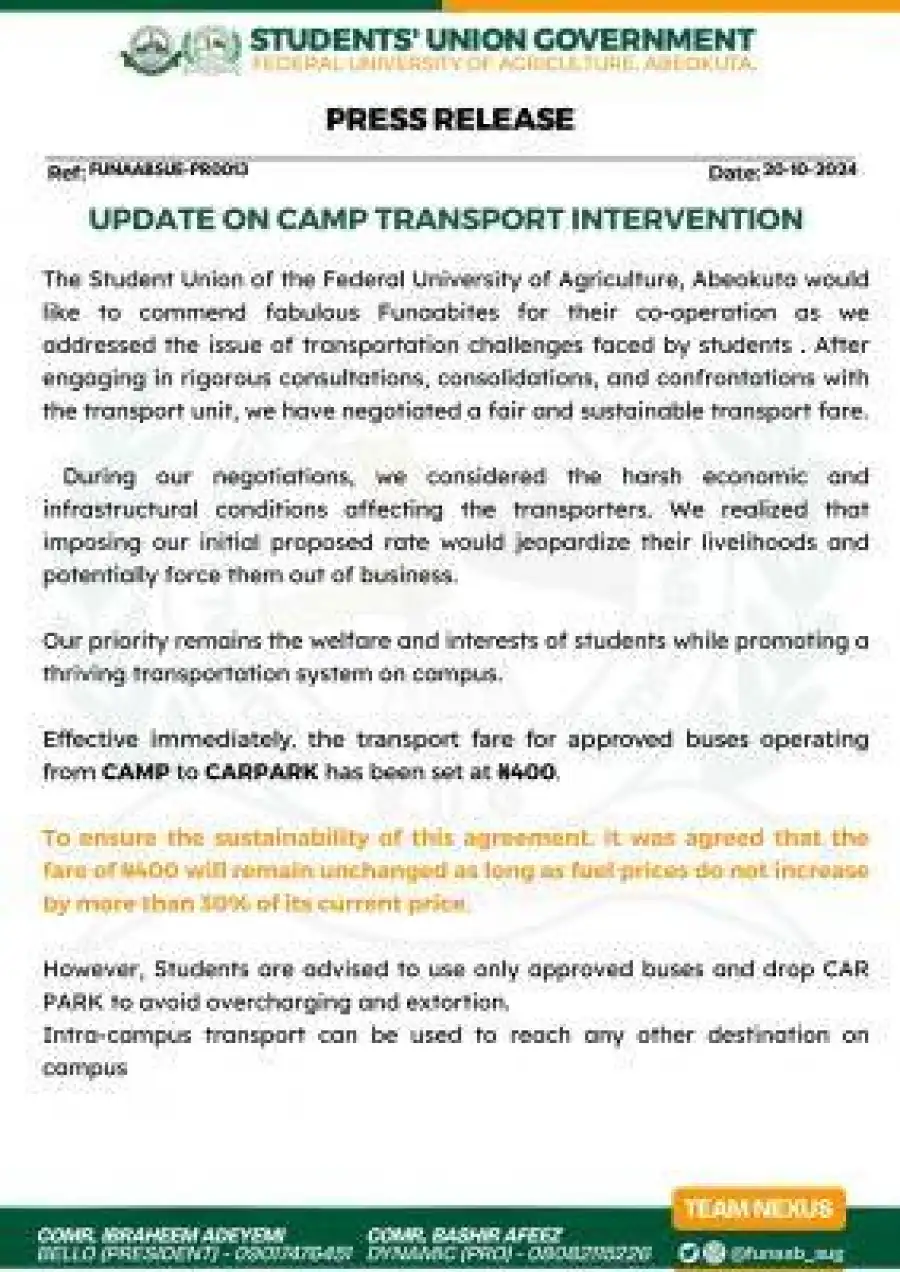 The Student Union of the Federal University of Agriculture, Abeokuta would like to commend fabulous Funaabites for their co-operation as we addressed the issue of transportation challenges faced by students.