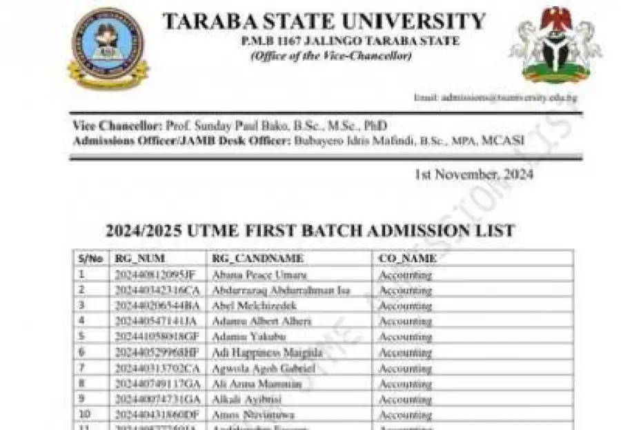 This is to inform the General Public that the Management of Taraba State University (TASU) has officially announced the release of the UTME First Batch Admission List for the 2024/2025 Academic Session.