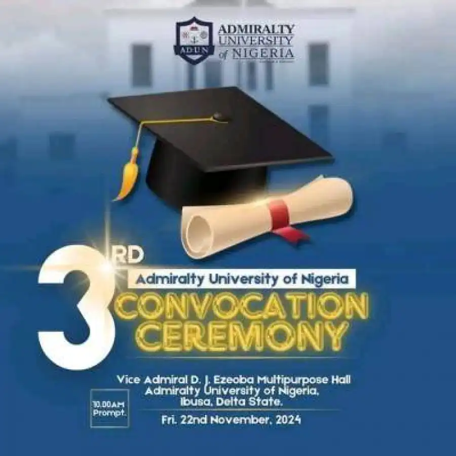 The management of the Admiralty University of Nigeria cordially invites the general public to her 3rd Convocation Ceremony which has been scheduled to take place as follows;