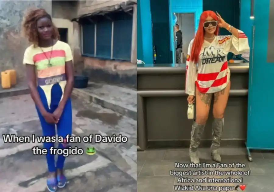 A Nigerian lady has drawn significant attention on social media after sharing a throwback photo of herself as a devoted fan of popular Nigerian singer Davido, alongside a recent photo depicting her current admiration for another Nigerian superstar, Wizkid.