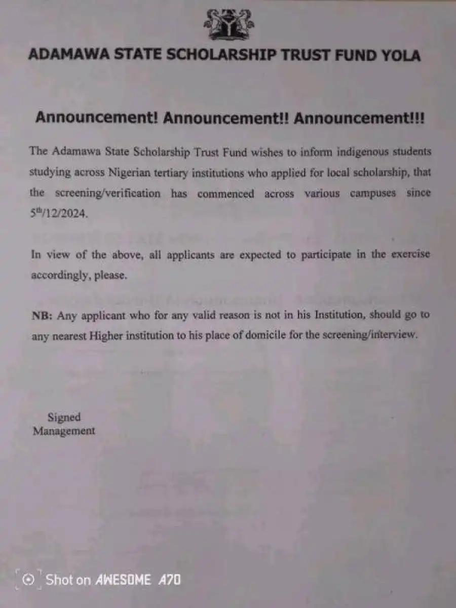The Adamawa State Scholarship Trust Fund wishes to inform indigenous students studying across Nigerian tertiary institutions who applied for local scholarship, that the screening/verification has commenced across various campuses since 5th/12/2024. In view of the above, all applicants are expected to participate in the exercise accordingly, please.