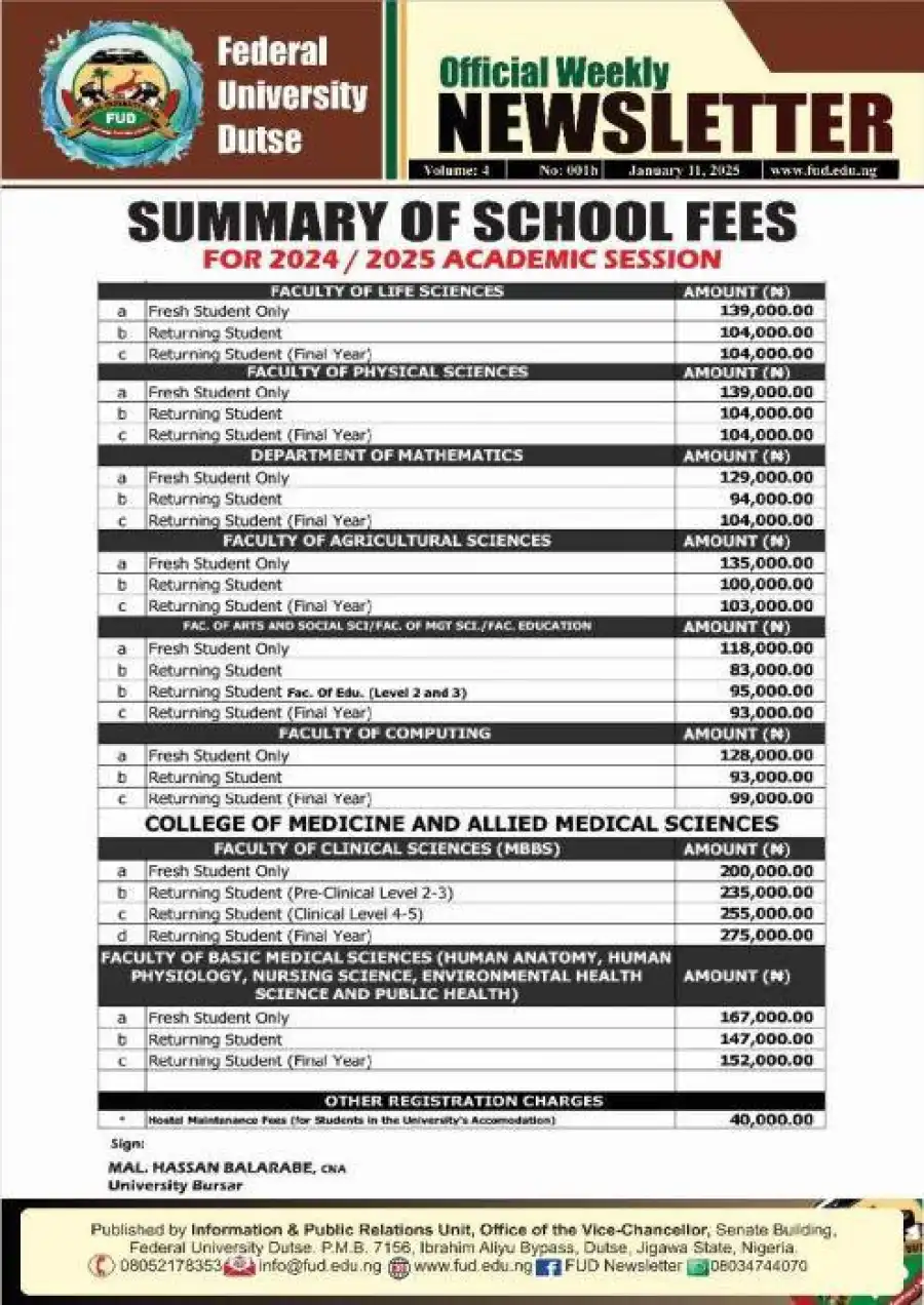 All students of the Federal University Dutse (FUDutse) are by this notice informed that the school fees payable for the 2024/2025 academic session are as captured on the image below.
