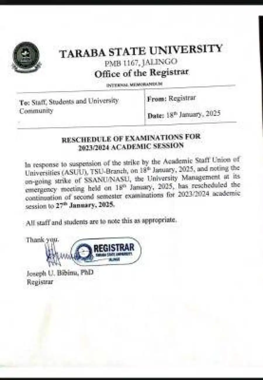 In response to suspension of the strike by the Academic Staff Union of Universities (ASUU), TSU-Branch, on 18th January, 2025, and noting the on-going strike of SSANU/NASU, the University Management at its emergency meeting held on 18th January, 2025, has rescheduled the continuation of second semester examinations for 2023/2024 academic session to 27th January, 2025.