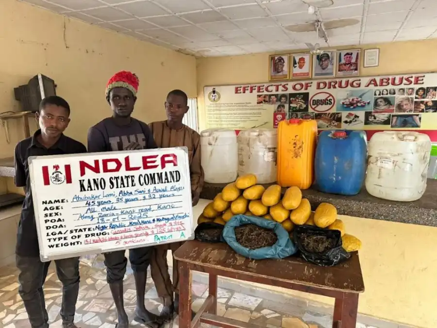 “A Nigerien, Abubakar Lami, 45, with two others—Abba Sani, 35, and Auwal Aliyu, 32—were arrested by NDLEA operatives at Gadar Tamburawa, Kano, while 13.1 kg of skunk and 125 liters of ‘suck and die,’ a new psychoactive substance, were recovered from them.