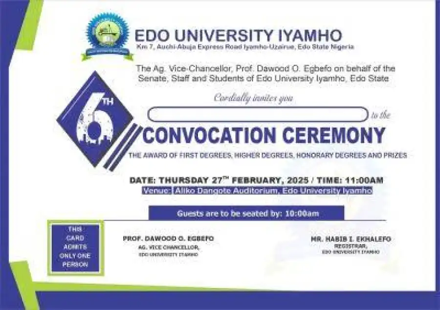 The Ag. Vice-Chancellor, Prof. Dwood O. Egbefo, on behalf of the Senate, Staff and students of Edo State University Iyamho, cordially invites the general public to the 6th Convocation Ceremony of the University.