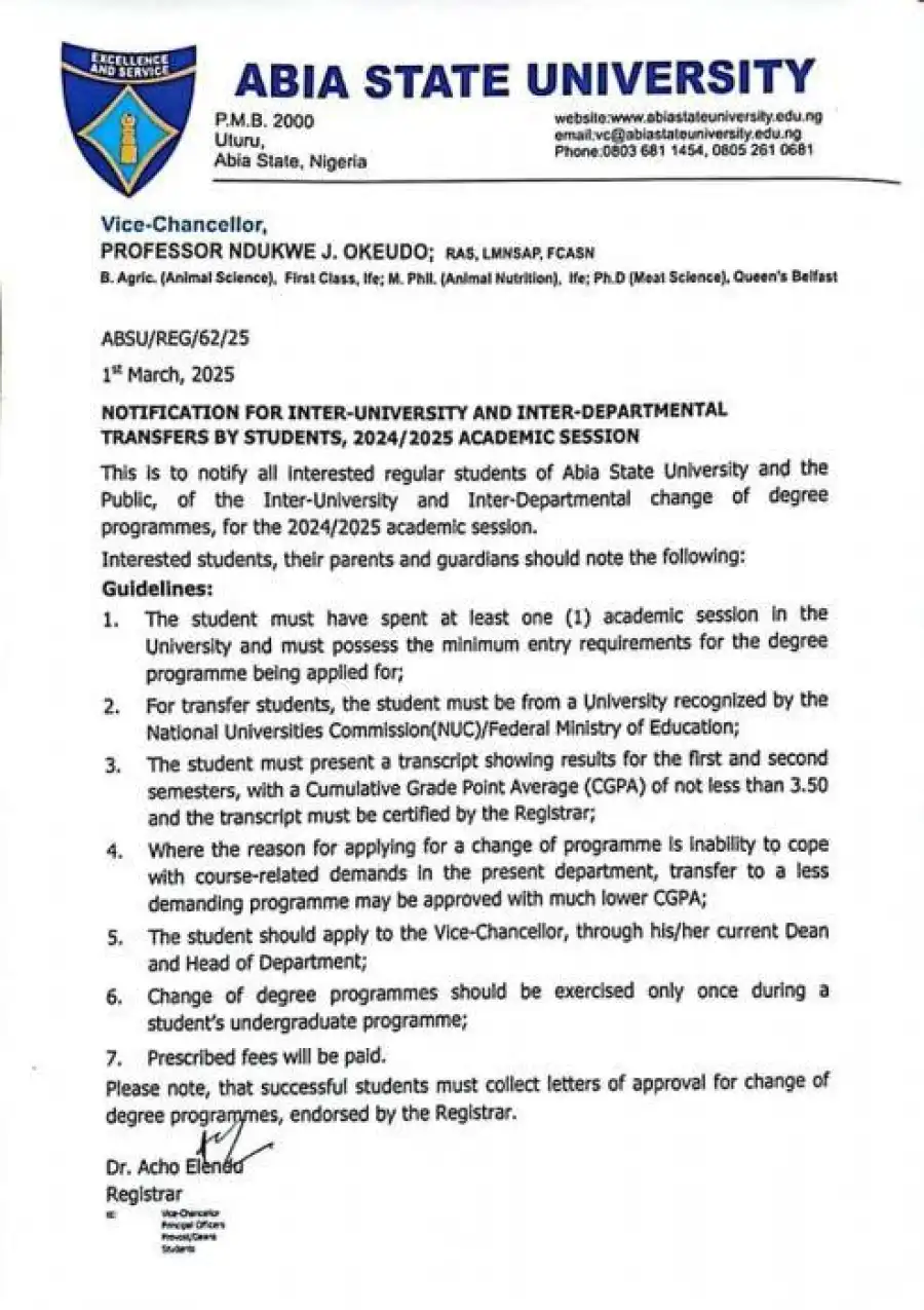 This is to notify all interested regular students of Abia State University and the Public, of the Inter-University and Inter-Departmental change of degree programmes, for the 2024/2025 academic session.