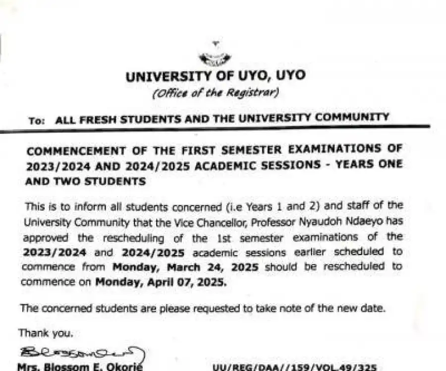 This is to inform all students concerned (i.e Years 1 and 2) and staff of the University Community that the Vice Chancellor, Professor Nyaudoh Ndaeyo has approved the rescheduling of the 1st semester examinations of the 2023/2024 and 2024/2025 academic sessions earlier scheduled to commence from Monday, March 24, 2025 should be rescheduled to commence on Monday, April 07, 2025.