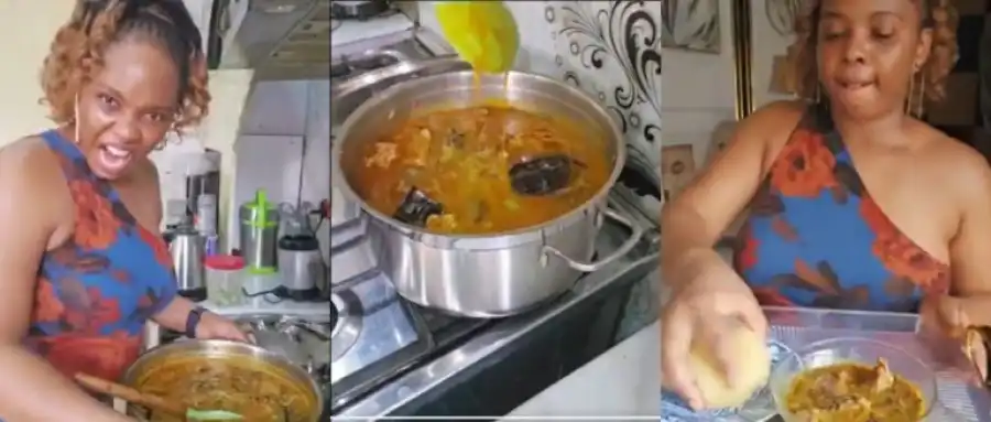 As the video came to a close, she was seen playfully holding a large serving of eba while enjoying the delicious soup, leaving fans laughing at her fun and quirky approach to cooking.