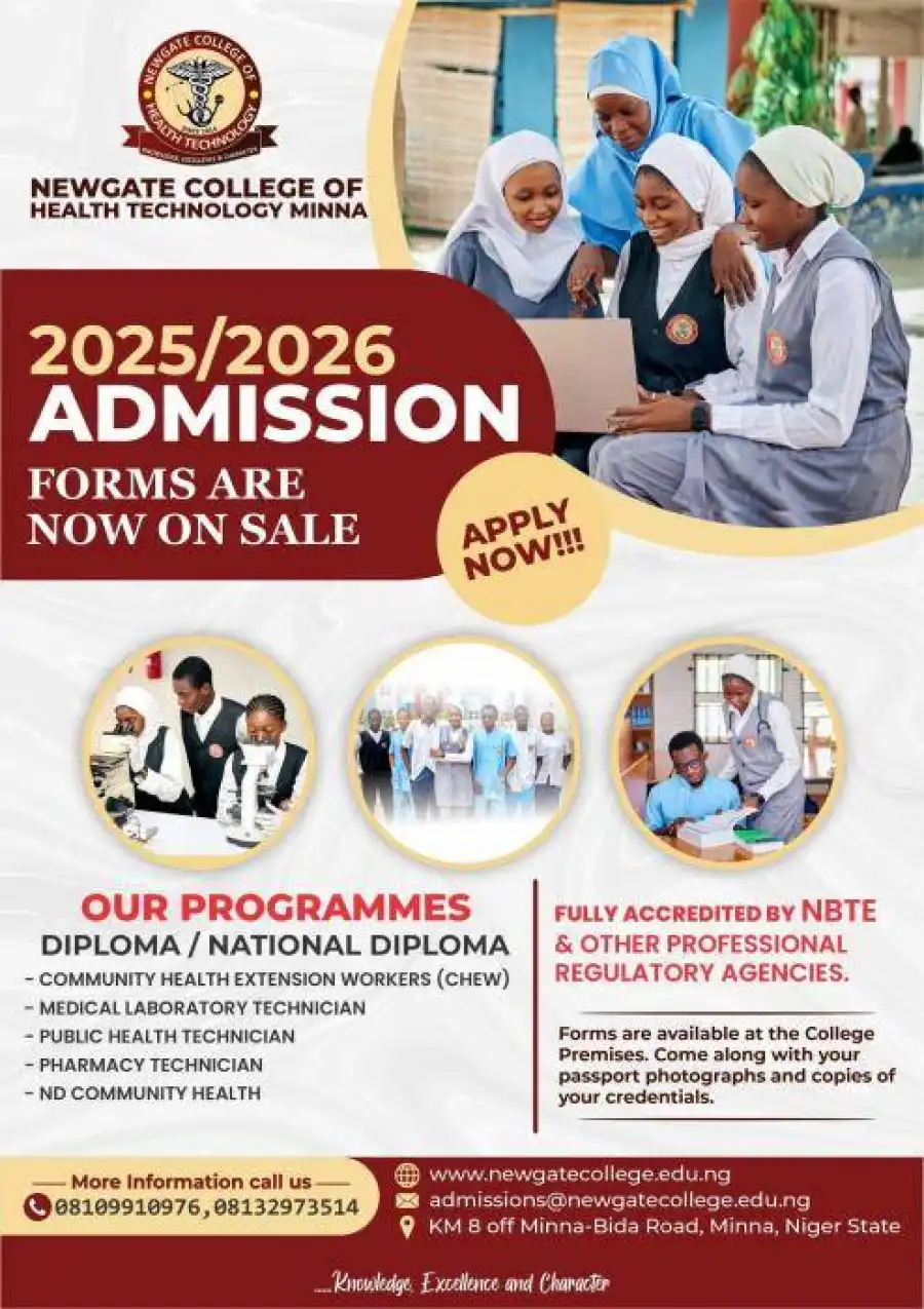 Applications are invited from suitably qualified candidates for Admission into Newgate college of Health Technology Minna Programmes for the 2025/2026 Academic Session.