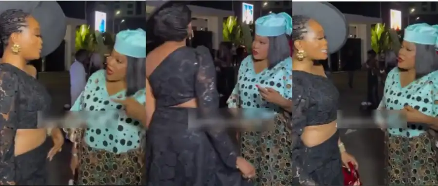 In the now-famous clip circulating online, Toyin Abraham approached Kie Kie at a high-profile event, teasing her about her daring fashion choice in a humorous and exaggerated manner.