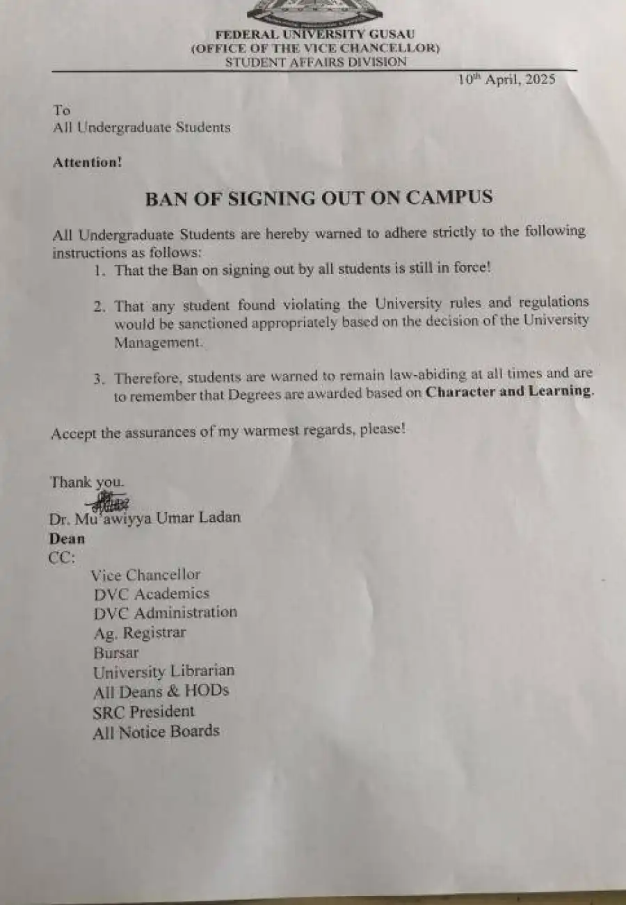 All Undergraduate Students of Federal University, Gusau are hereby warned to adhere strictly to the following instructions as follows: