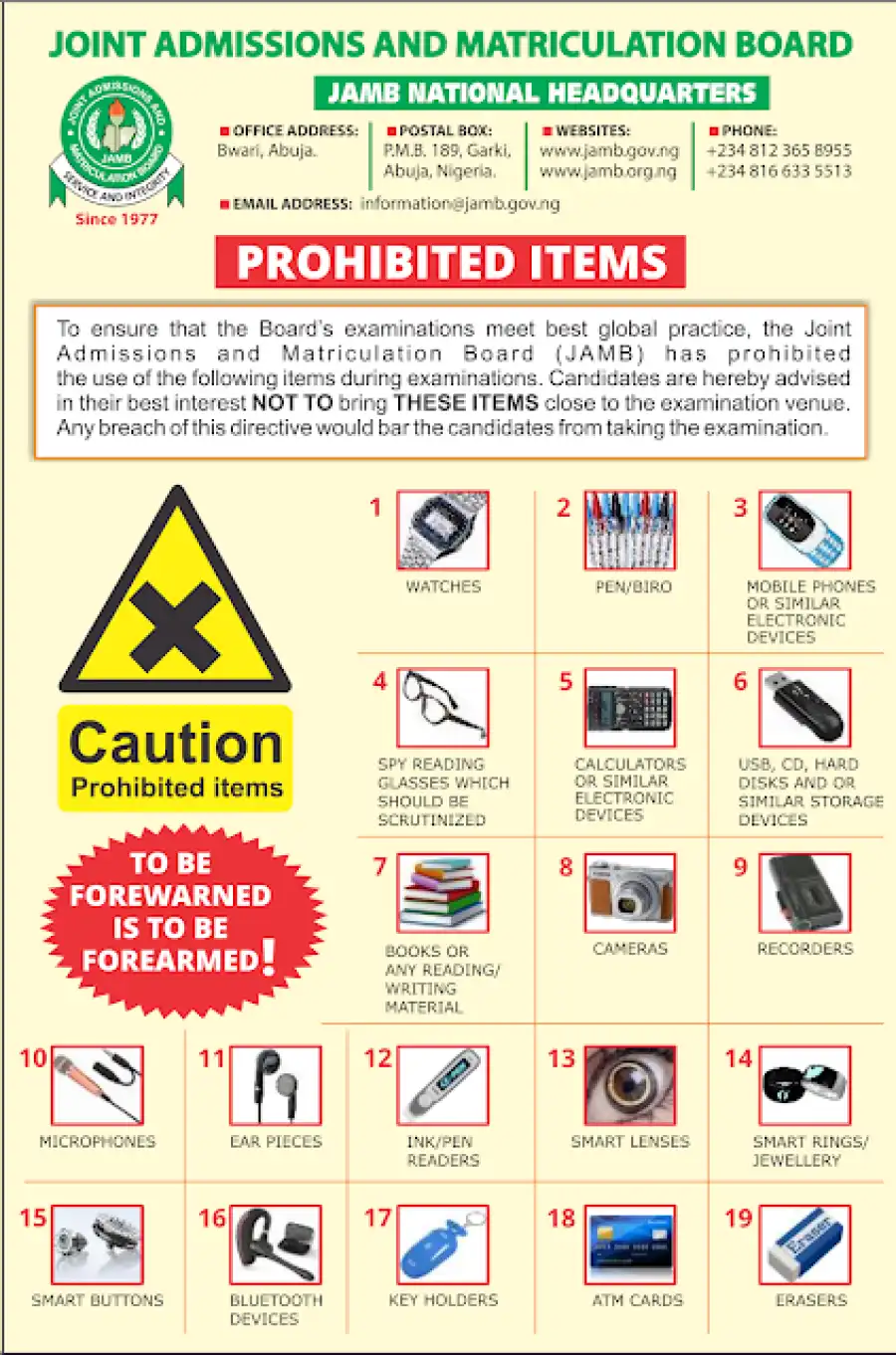 JAMB's list of prohibited items in the exam hall and instructions on biometric verification