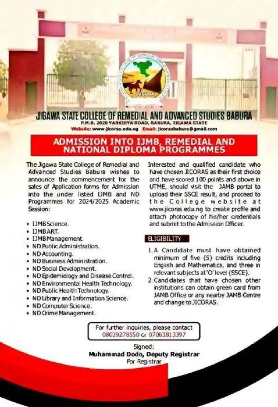 The Jigawa State College of Remedial and Advanced Studies, Babura wishes to announce the commencement for the sales of Application forms for Admission into the under listed IJMB and ND Programmes for 2024/2025 Academic Session: