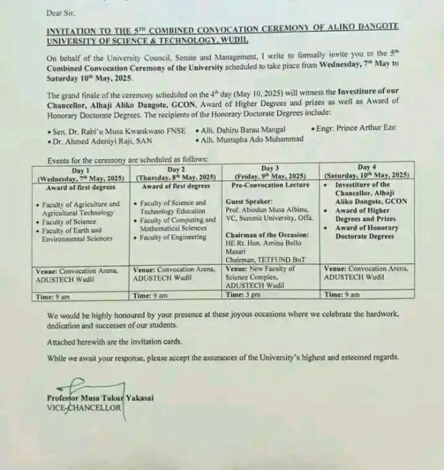 Day 1 (Wednesday, 7th May, 2025)Day 2 (Thursday, 8th May, 2025)Day 3 (Friday, 9th May, 2025)Day 4 (Saturday, 10th May, 2025)Award of first degrees – Faculty of Agriculture and Agricultural Technology – Faculty of Science – Faculty of Earth and Environmental Sciences Venue: Convocation Arena, ADUSTECH Wudil Time: 9 amAward of first degrees – Faculty of Science and Technology Education – Faculty of Computing and Mathematical Sciences – Faculty of Engineering Venue: Convocation Arena, ADUSTECH Wudil Time: 9 amPre-Convocation Lecture Guest Speaker: Prof. Abiodun Musa Aibinu, VC, Summit University, Offa Chairman of the Occasion: HE Rt. Hon. Aminu Bello Masari Chairman, TETFUND BoT Venue: New Faculty of Science Complex, ADUSTECH Wudil Time: 3 pm– Investiture of the Chancellor, Alhaji Aliko Dangote, GCON – Award of Higher Degrees and Prizes – Award of Honorary Doctorate Degrees Venue: Convocation Arena, ADUSTECH Wudil Time: 9 am