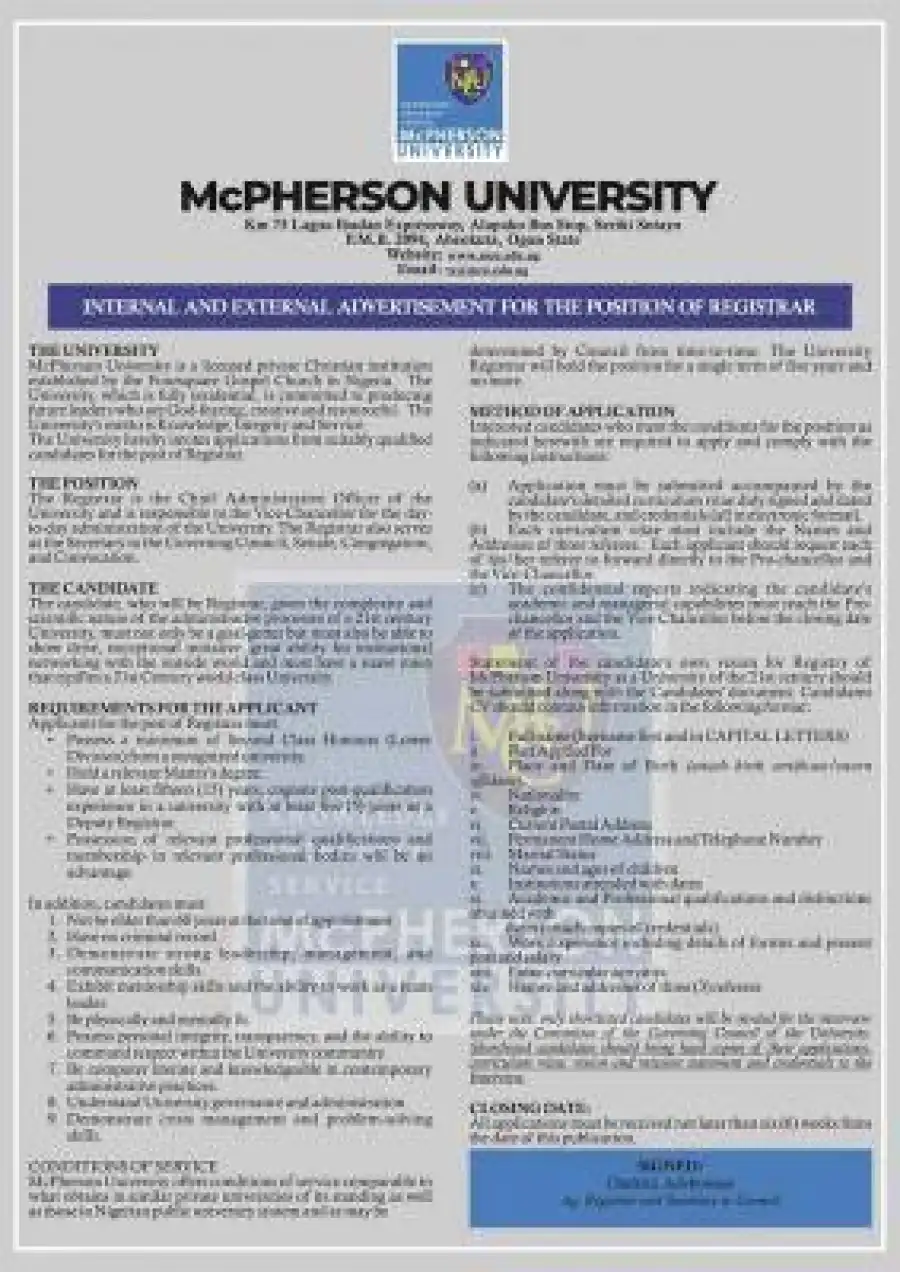 McPherson University offers conditions of service comparable to what obtains in similar private universities of its standing as well as those in Nigerian public university system and as may be determined by Council from time-to-time. The University Registrar will hold the position for a single term of five years and no more.