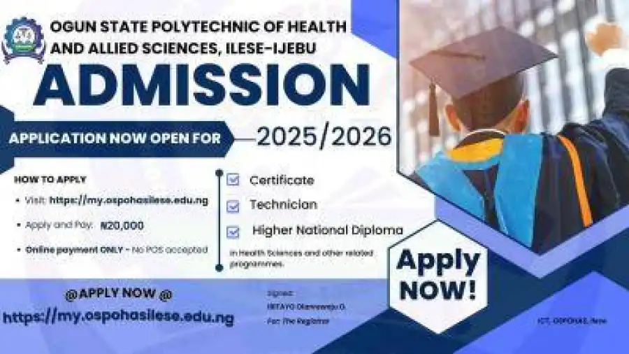 This is to inform Prospective Applicants and the General Public that Ogun State Polytechnic of Health and Allied Sciences, Ilese-Ijebu has commenced the 2026/2026 Admission Exercise in Certificate, Technician and Higher National Diploma in Health Sciences and other Health related programmes.