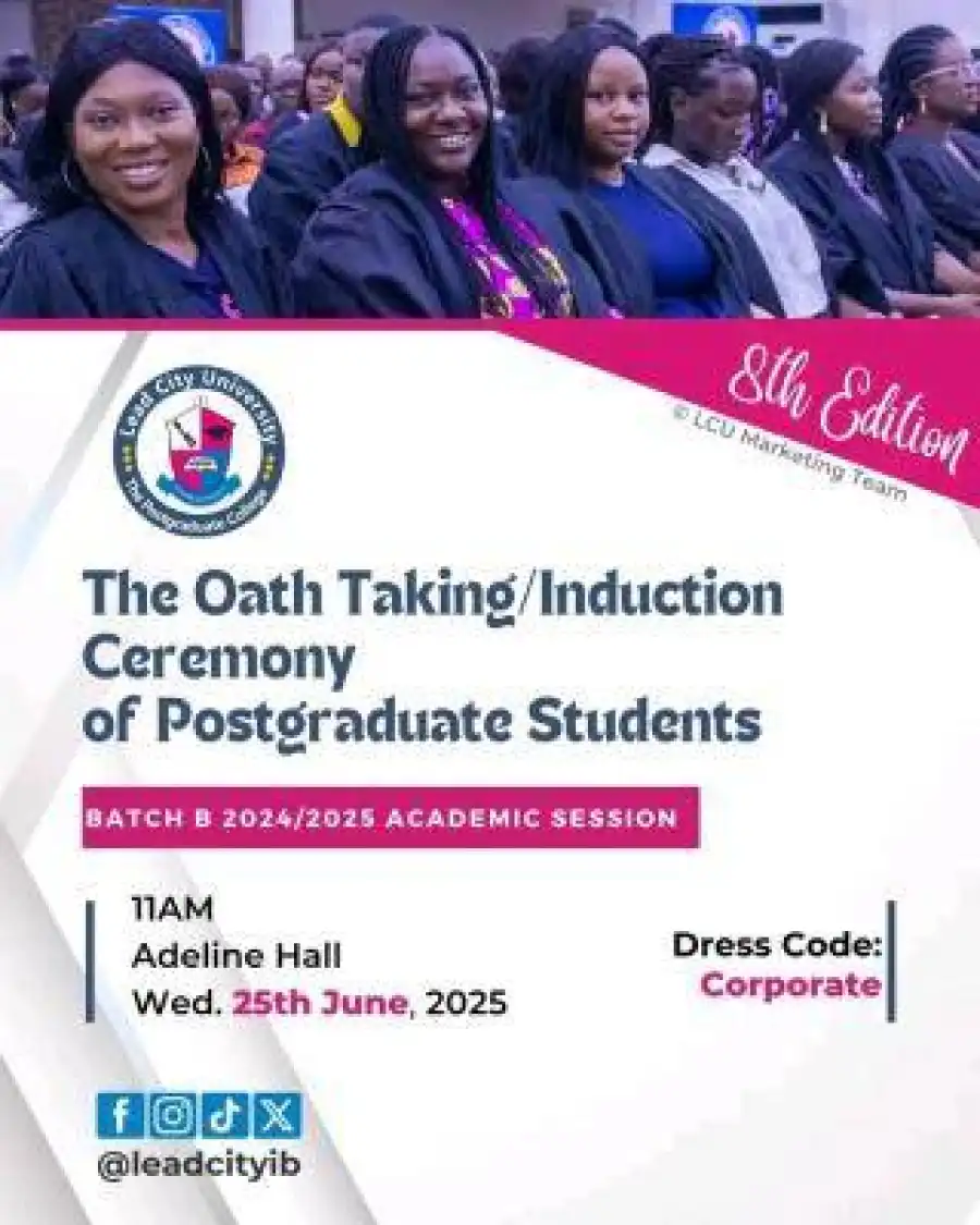 The School of Postgraduate Studies, Lead City University cordially invites the general public to her Oath-Taking/Induction Ceremony which has been scheduled to take place as follows;