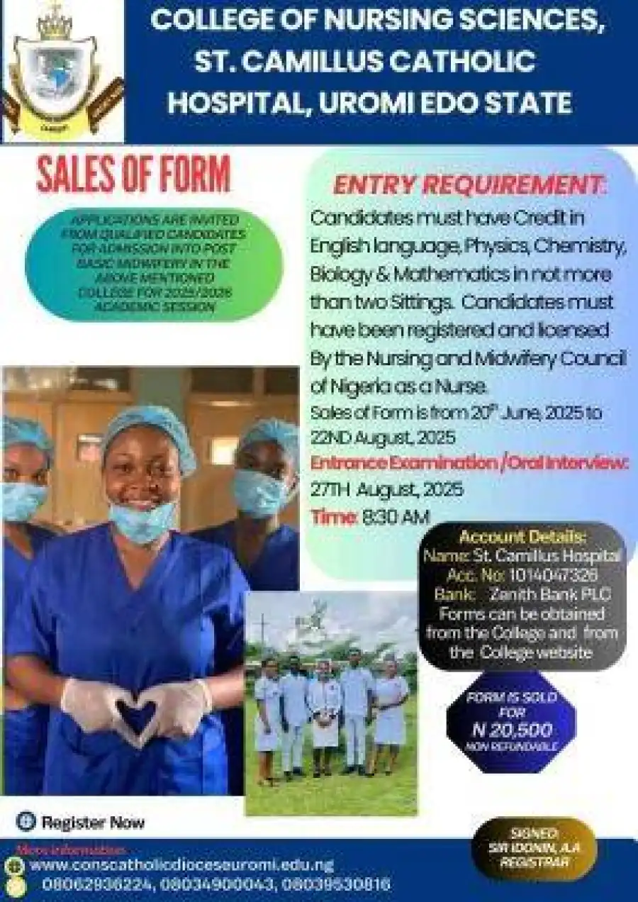 Applications are hereby invited from suitably qualified candidates for admission into the Post Basic Programme College of Nursing Sciences, St. Camillus Catholic Hospital, Uromi, Edo State for the 2025/2026 Academic Session.