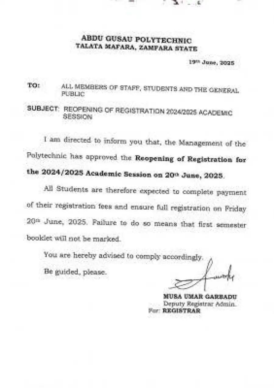 This is to inform the staff and students of the Abdu Gusau Polytechnic the the school management has approved the reopening of registration for the 2024/2025 academic session on Friday, 20th June, 2025.