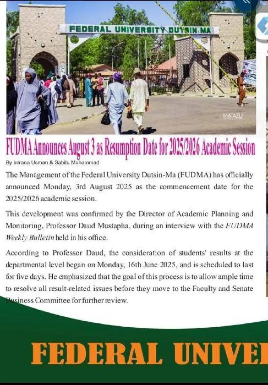 The Management of the Federal University Dutsin-Ma (FUDMA) has officially announced Monday, 3rd August 2025 as the commencement date for the 2025/2026 academic session.