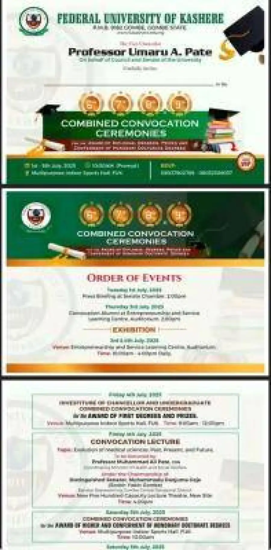 The Vice-Chancellor Professor Umaru A. Pate on behalf of the Council of Senate and the University cordially invites the general public to her 6th, 7th, 8th & 9th Combined Convocation Ceremonies for the Award of Diplomas, Degrees, Prizes and Conferment of Honorary Doctorate Degrees.