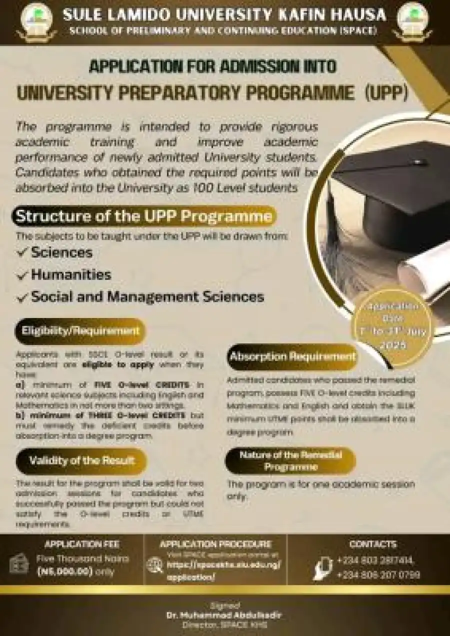 Applications are hereby invited from interested candidates for admission into the University Preparatory Programme (UPP) of the Sule Lamido University for the 2025 Academic Year.