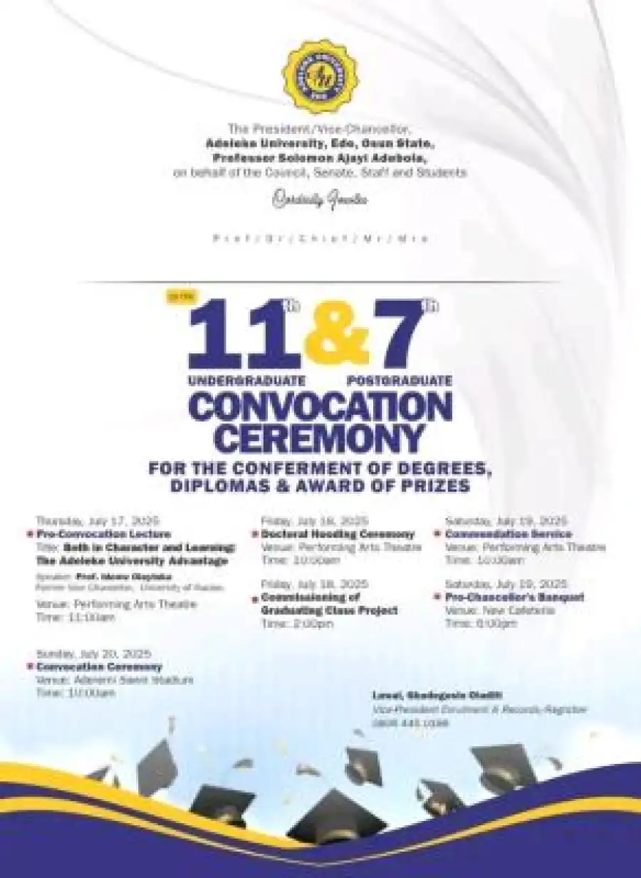 The President/Vice-Chancellor, Adeleke University, Ede Osun State, Professor Solomon Ajayi Adebola on behalf of the Council, Senate and Staff and Students if the University cordially invites the general public to the 11th Undergraduate & 7th Postgraduate Convocation Ceremony for the Conferment of Degrees, Diplomas and Award of Prizes.