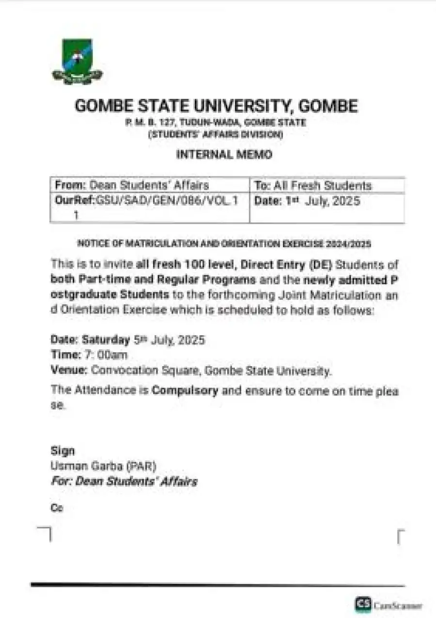 This is to invite all fresh 100 Level, Direct Entry (DE) students of both Part-time and Regular Programs and the newly admitted Postgraduate students of the Gombe State University (GOMSU) to the forthcoming Joint Matriculation an d Orientation Exercise which is scheduled to hold as follows;